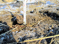 飯舘村は年明けから本格的に冷え込み、実験農地の土壌の表面は「霜柱」というよりは固い「凍土」状態となっています。この凍土の厚みは地中に埋められた試験管内の氷の厚さで計測でき、5cm程度であることが確認できました。