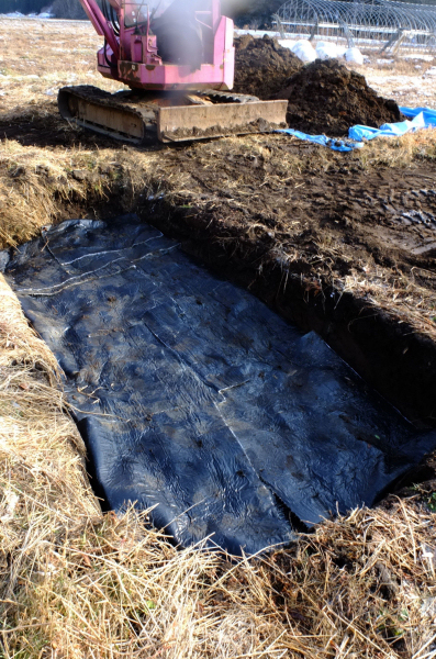 今回は二本松市などにおける除染にも実績のある「ボルクレイ・マット」というシートを使って除染土を包み、その上から覆土を被せるという処理を行いました。ボルクレイ・マットは2枚の布の間にベントナイトを挟んだ構造になっていて遮水効果があります。
