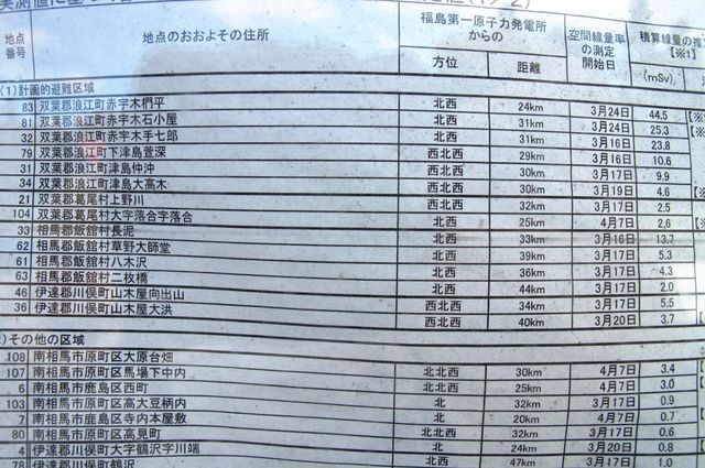 帰りがけに、高汚染地区の長泥地区に置いてある文科省の放射線測定機による測定結果を貼りだしてある掲示板を見たら、計画的避難区域での昨年の3月から、今年の1月までの積算放射線量の一番大きい地区は、44.5mSvでした。年間にすると、53mSvと言ったところでしょうか。