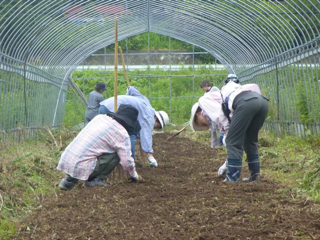 田植えと並行してビニールハウス内にさつまいもの栽培ベッドを整備し、田植えが終わった後の7月14日に苗を植えました。
