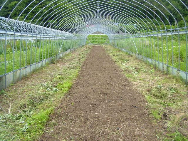 ハウスの幅5.4mの表土5㎝を中央部に集め、高さ約20㎝×幅1m×長さ36mの栽培ベッドを作りました。