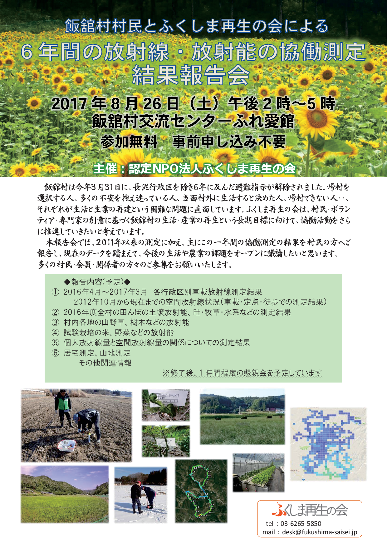 再生の会では、村民の方と協働して放射線・放射能測定を継続してきました。この一年間の測定結果を中心に、得られたデータを踏まえ、今後の課題や活動の方向などについて議論していきたいと考えています。