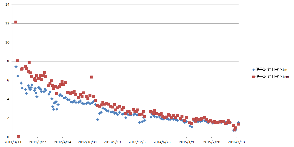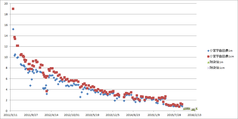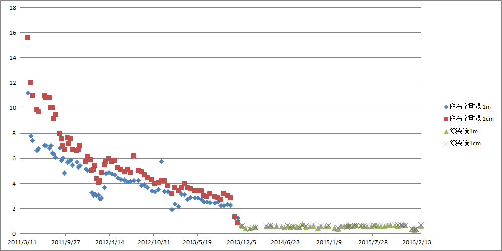 飯舘村役場が測定し「広報いいたてお知らせ版」に掲載している空間線量率をグラフ化したものです。